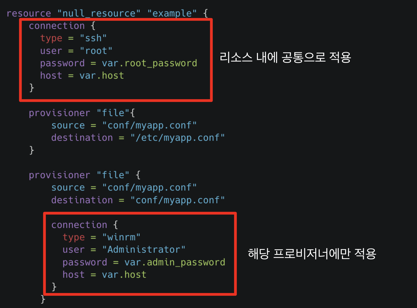 connection 블록은 리소스에 선언되는 경우 해당 리소스 내에 구성된 프로비저너에 대해 공통으로 선언되고, 프로비저너 내에 선언되는 경우 해당 프로비저너에만 적용됩니다.