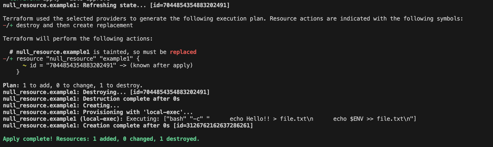 | resource "null_resource" "example1" { provisioner "local-exec" { command = <<EOF echo Hello!! > file.txt echo $ENV >> file.txt EOF interpreter = [ "bash" , "-c" ] working_dir = "/tmp" environment = { ENV = "world!!" } } } |
