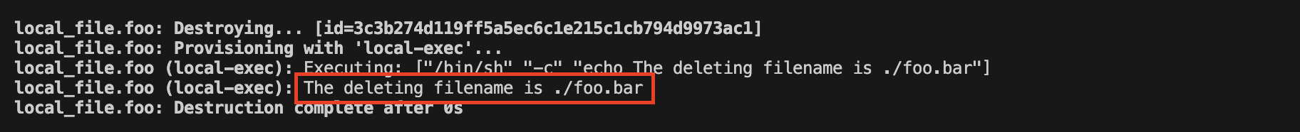 세번째 프로비저너에 대해서는 terraform apply를 실행했을 때 관련 출력을 찾을 수 없습니다. when = destroy 구문에 의해 terraform destroy를 수행할 때에만 정보를 출력합니다.