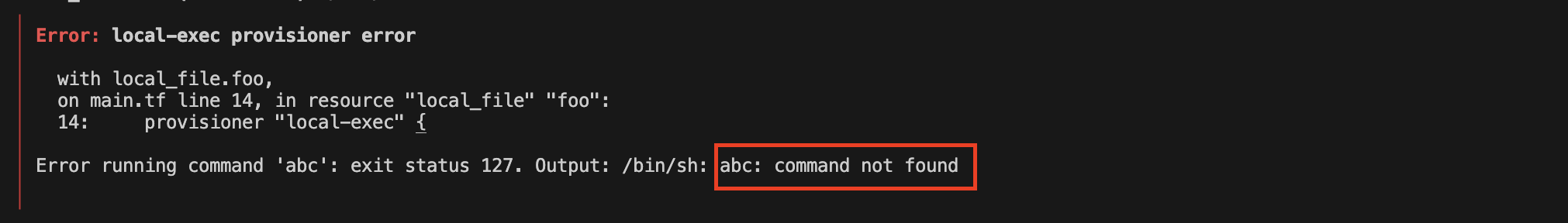 해당 속성에 대해 주석 처리한 후 terraform apply를 실행하게 되면 아래와 같이 command not found 를 반환하며 실패합니다.