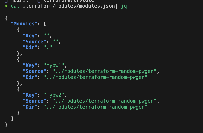 terraform init 이후에 .terraform/modules/modules.json 파일을 확인해보면 여러 개의 모듈 정의가 선언되어 있고 테라폼 구성에서 선언한 값이 각각 정의된 것을 확인하실 수 있습니다.