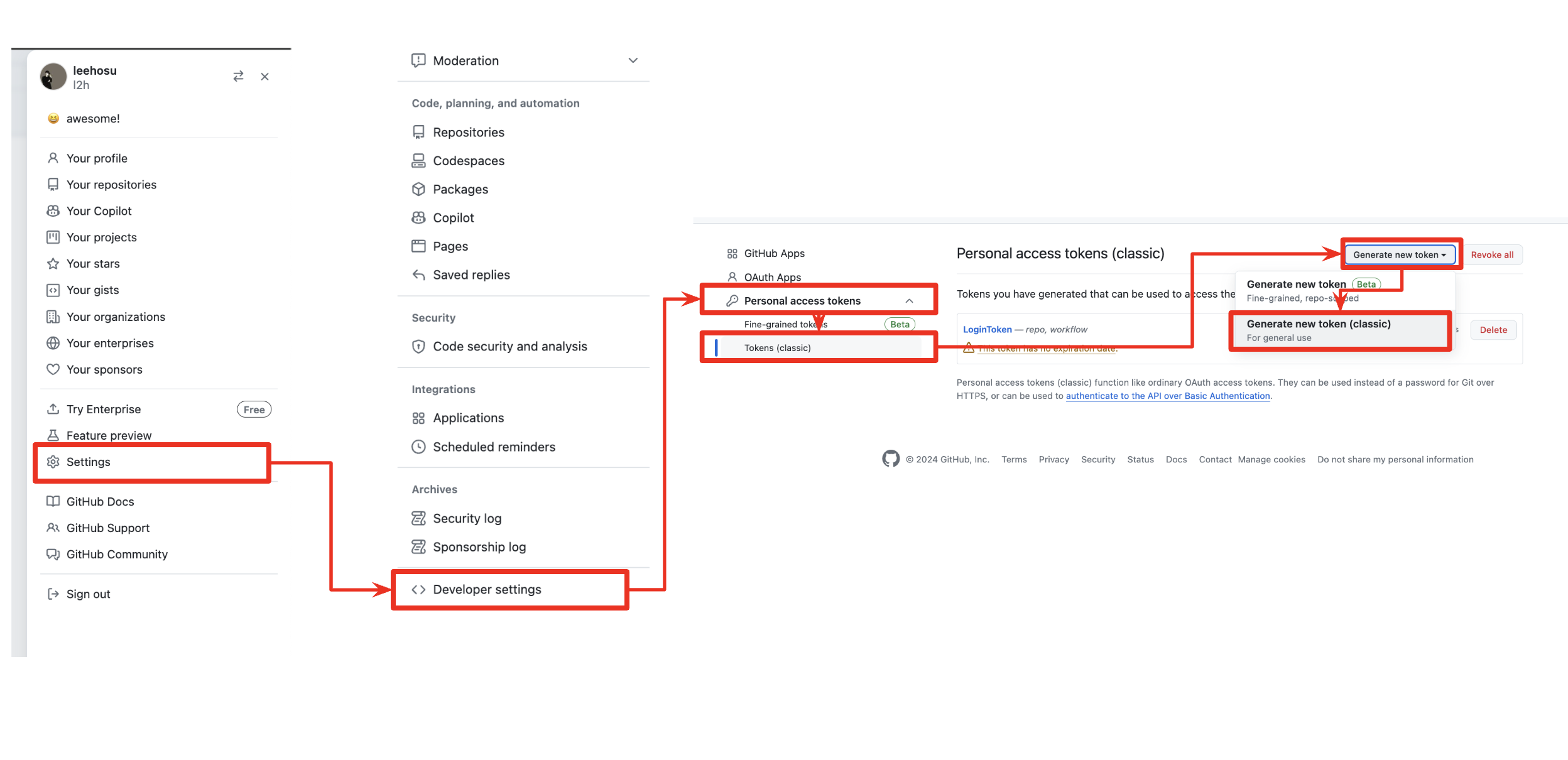 위의 사진을 토대로 Profile -> Settings → Developer settings ⇒ Personal access tokens -> Tokens (classic) -> Generate New Token(classic) 의 경로로 설정해주시면 됩니다.