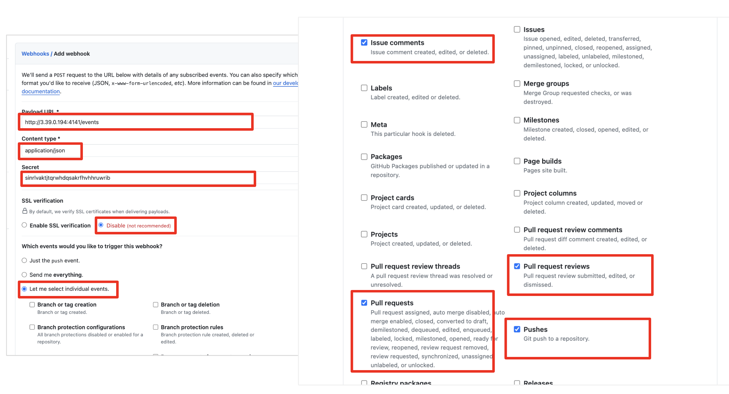 그 후 payload를 보내기 위한 Payload URL(http://<EC2공인IP>:4141/events)을 입력하고, Content Type은 application/json으로 선택하며 특히 Secret에 위에서 생성한 랜덤 secret 값을 입력해줍니다. 마지막으로 어떤 action에 trigger할 것인지 선택해주셔야 하는데, [Issue comments, Pull request reviews, Pushes, Pull requests] 를 선택합니다.