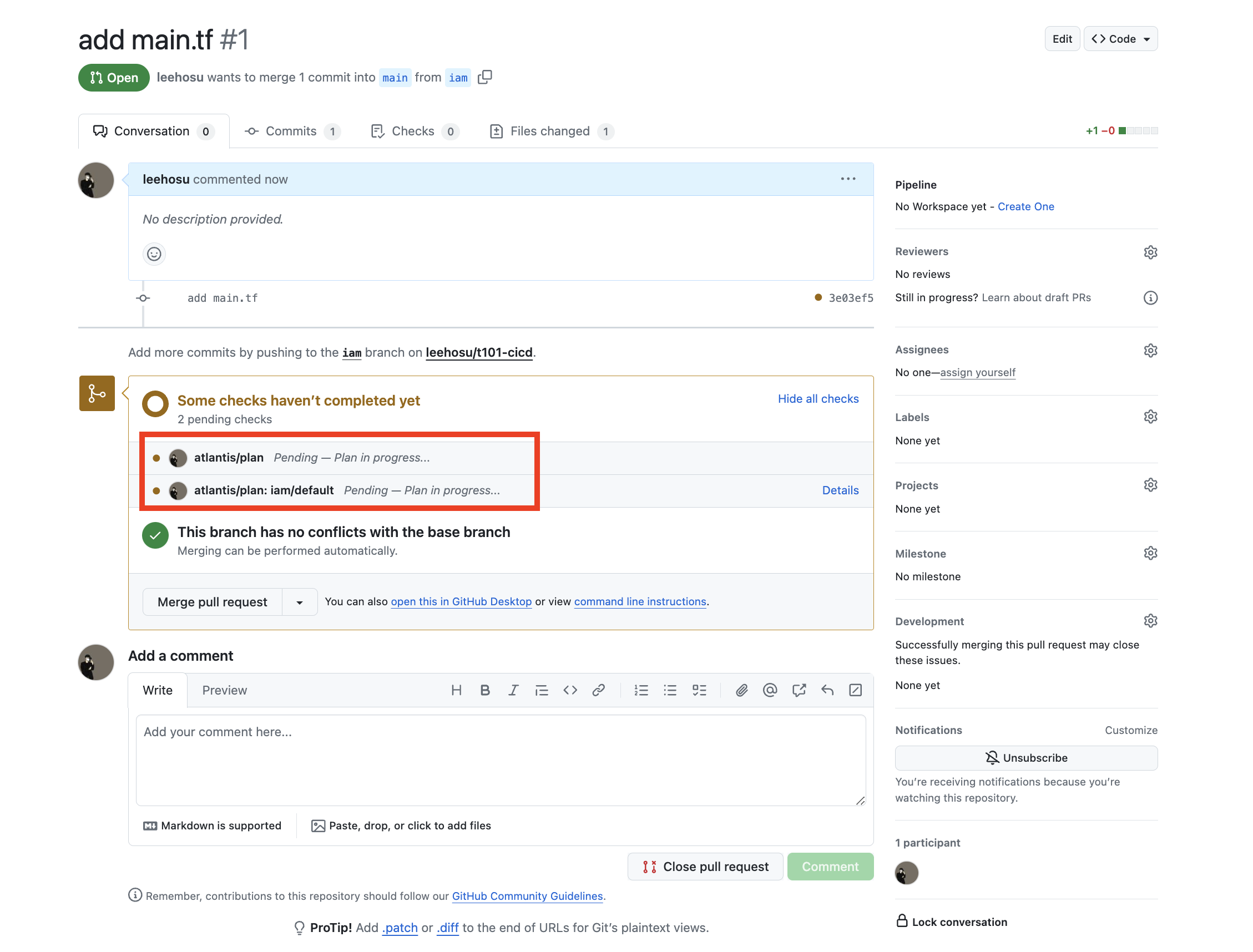위의 사진처럼 atlantis가 해당 액션(PR)을 trigger하여 자동으로 terraform init&plan을 진행합니다