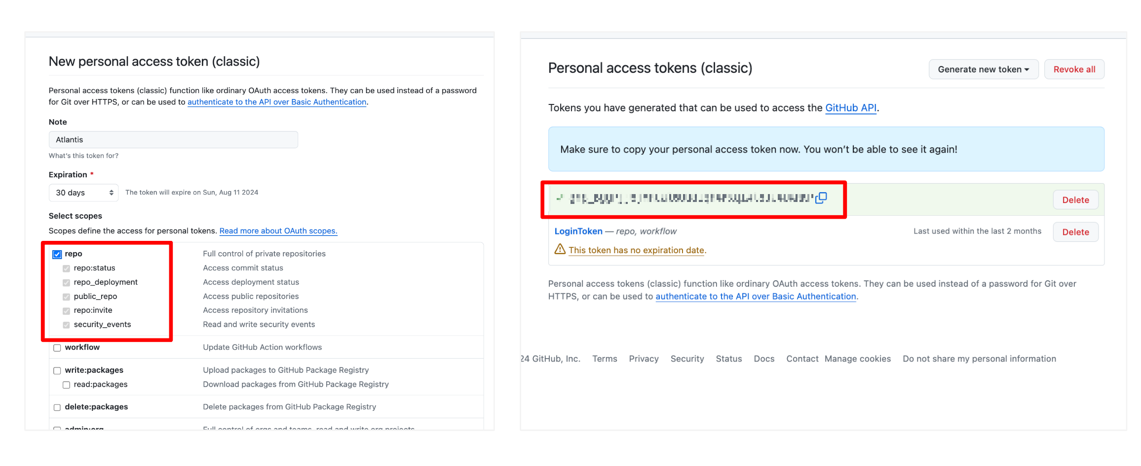 이때, 보안을 위해 Select Scope를 repo 범위로 제한합니다. 그렇게 설정을 마친 뒤 생성하게 되면 오른쪽의 사진과 같이 Token을 발급 받을 수 있습니다.