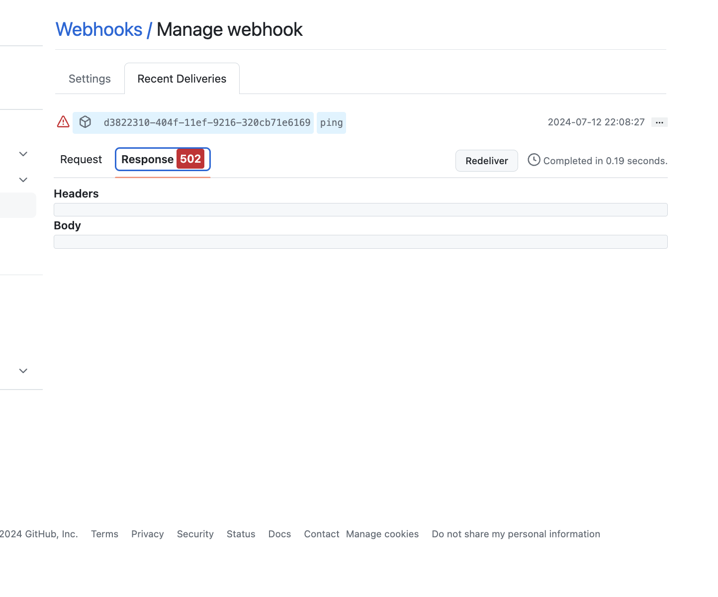 이렇게 생성한 후 webhook 상태를 확인해보면 502 에러로 인해 ping 전송이 실패한 것으로 보입니다. 아직 Atlantis Server가 배포되어 있지 않으니 당연한 결과겠죠?