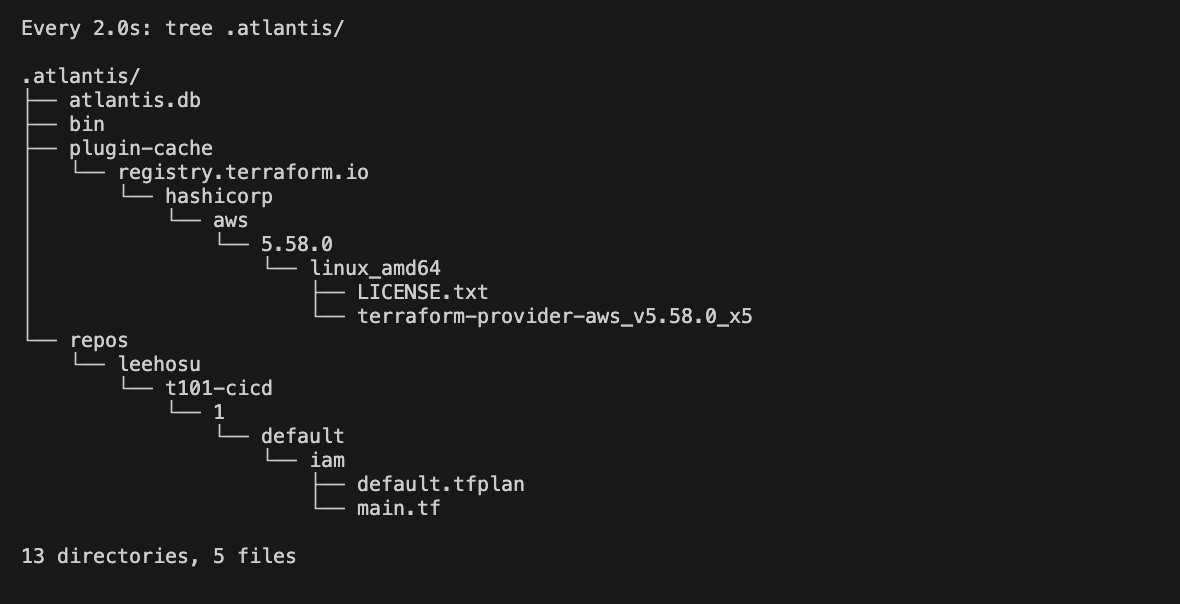 위의 명령어로 현재 atlantis의 디렉토리 구조가 어떻게 변하는지 보겠습니다. 현재는 atlantis.db와 bin 디렉토리, plugin-cache 디렉토리만 존재하는 것을 확인하실 수 있습니다.