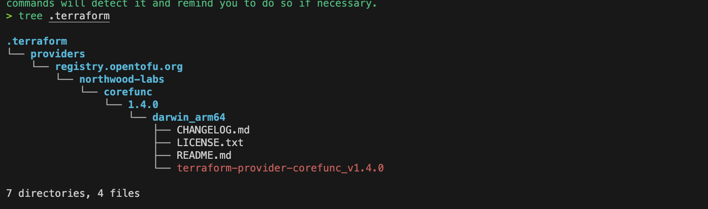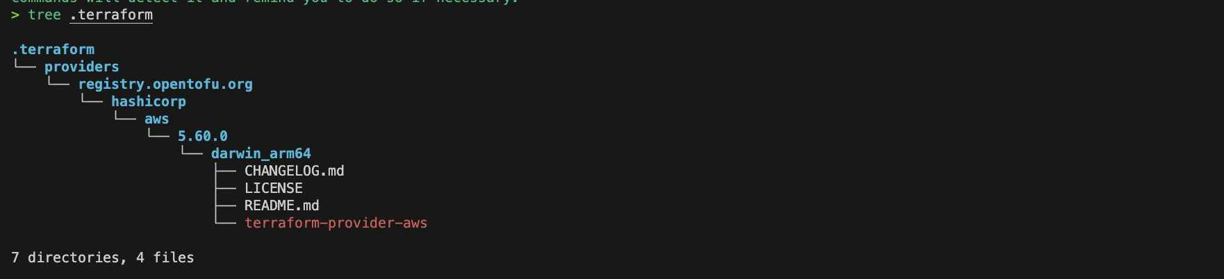 이때, tree 명령어로 providers의 구조를 살펴보면 registry.opentofu.org에서 다운로드된것을 확인하실 수 있습니다. (terraform registry가 아님!)