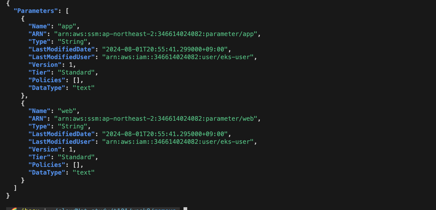 ssm parameter 정보를 출력해보면 2개가 배포되어있는 상태입니다.