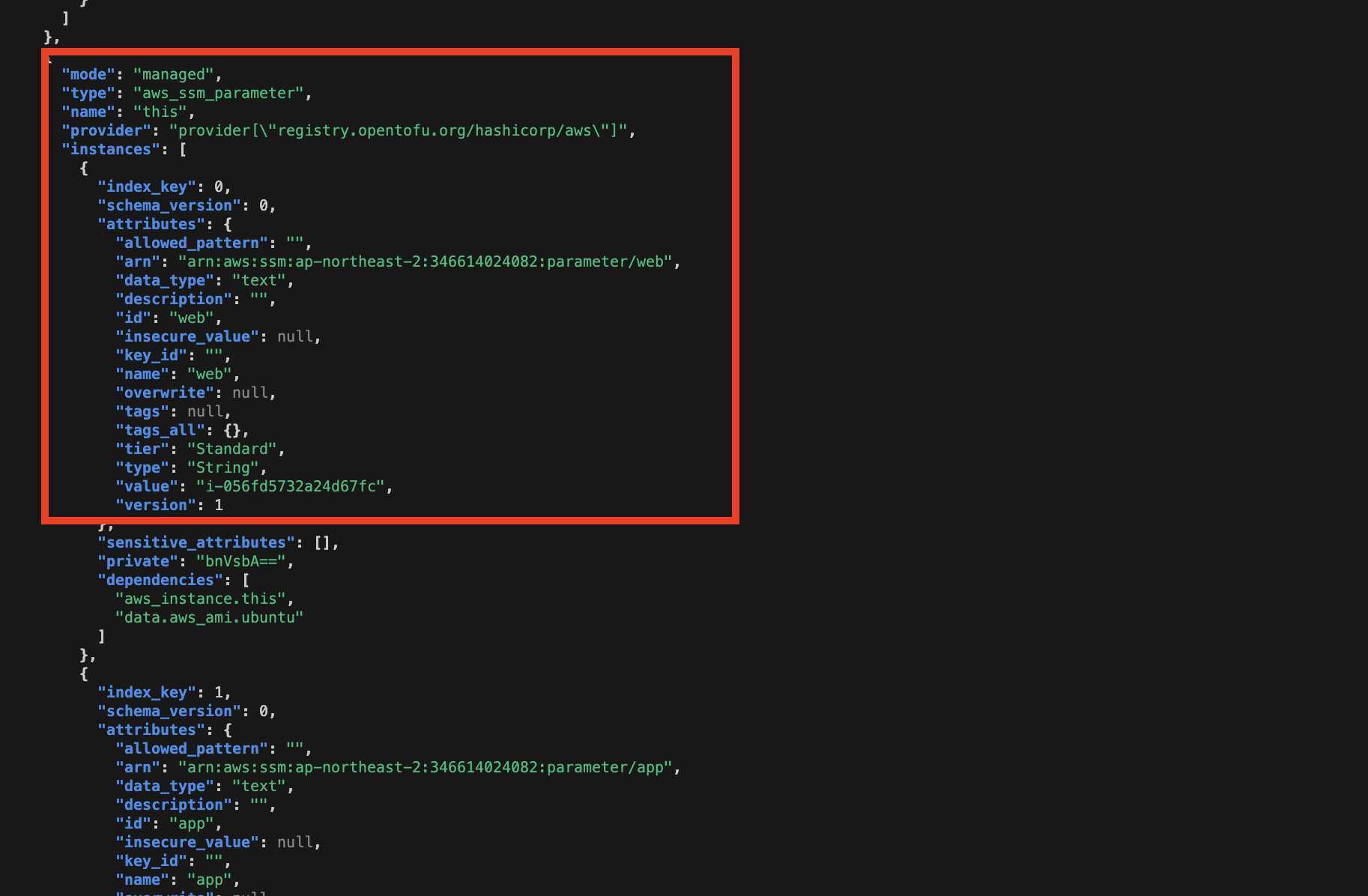 aws_ssm_parameter resource가 tfstate 파일에 생성된 것을 확인하실 수 있습니다.