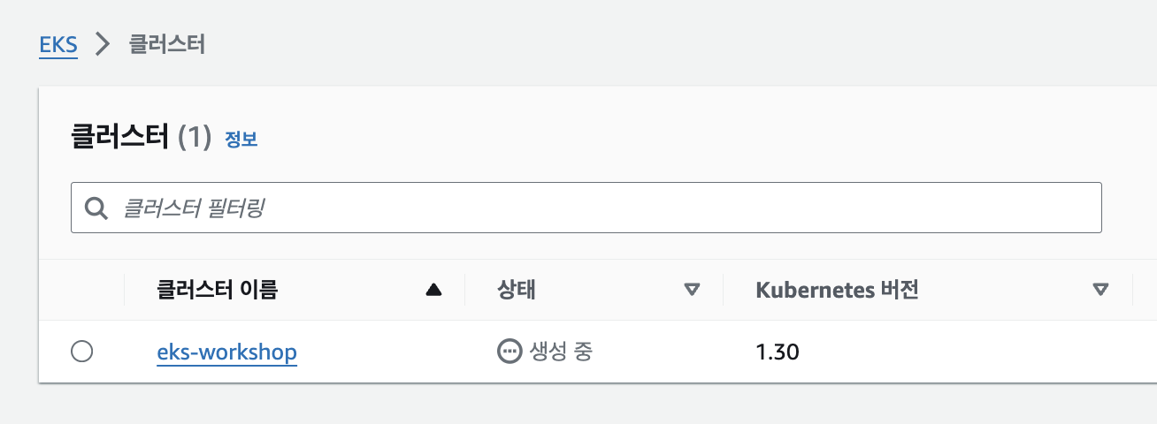 생성에 10분정도 소요되니 명령어를 실행하신 후 AWS Console에서 EKS로 가서 확인해보시면 EKS Cluster가 생성 중임을 확인하실 수 있습니다.