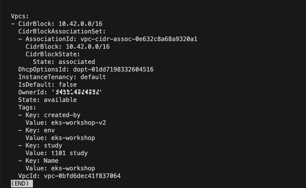 위의 aws cli 명령어를 통해 현재 계정에 배포되어있는 VPC 목록을 확인합니다.