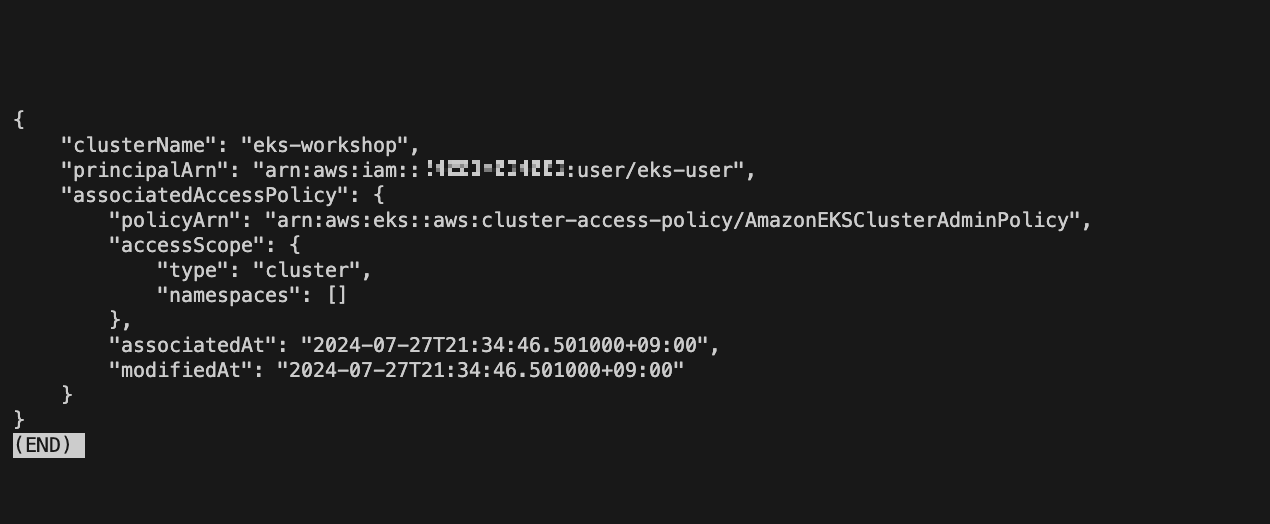 aws eks associate-access-policy --cluster-name eks-workshop --principal-arn arn:aws:iam::${ACCOUNT_ID}:user/${MYIAMUSER} \