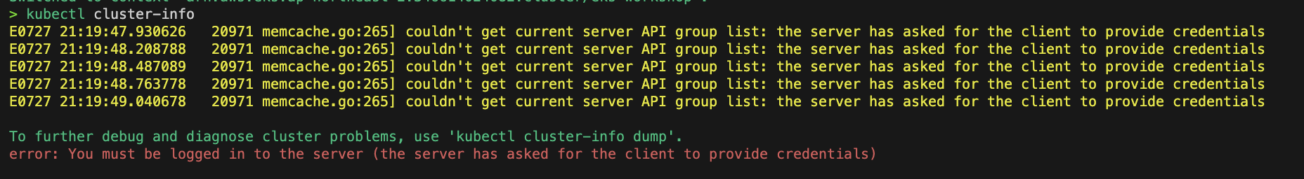 위의 사진처럼 현재 자격증명이 이루어지지 않아 AWS EKS Cluster에 접근할 수 없는 것을 확인하실 수 있습니다.
