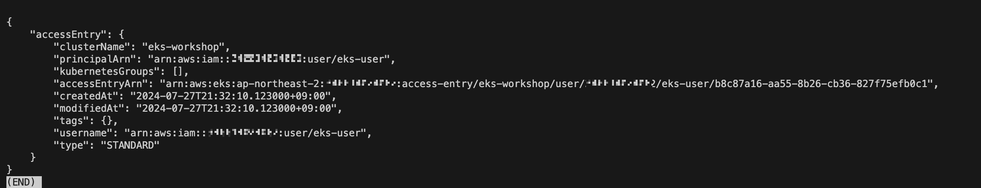 aws eks create-access-entry --cluster-name eks-workshop --principal-arn arn:aws:iam::${ACCOUNT_ID}:user/${MYIAMUSER}