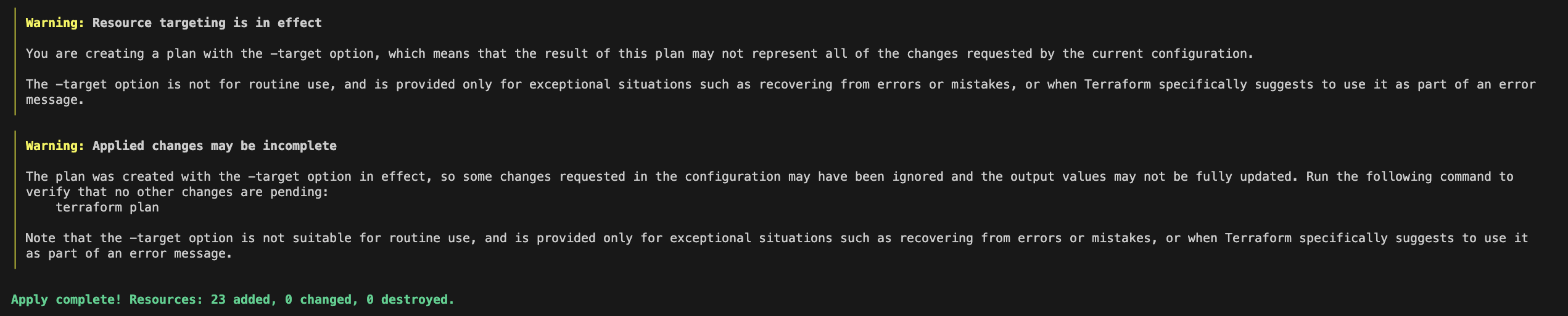 Warning 경고는 -target 옵션을 사용할 때 전체 구성에서 필요한 모든 변경 사항이 적용되지 않을 수 있음을 사용자에게 경고하는 메시지입니다. -target을 지정하여 따로 배포하는 것은 리소스 간의 종속성 문제와 상태 불일치가 발생할 수 있습니다.