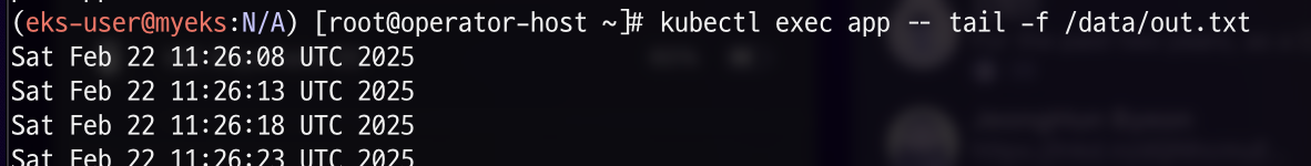 위의 명령어로 app pod에 접근해서 /data/out.txt 파일을 확인해 보겠습니다.