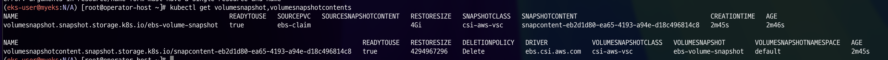 위 명령어로도 현재 생성되어 있는 volumesnapshot을 조회할 수 있습니다.
