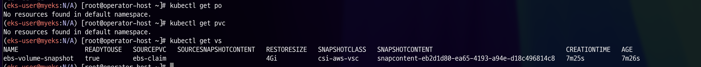 Pod와 PVC는 삭제했기에 현재 아무것도 없고, VolumeSnapshot만 조회되는 것을 확인하실 수 있습니다.