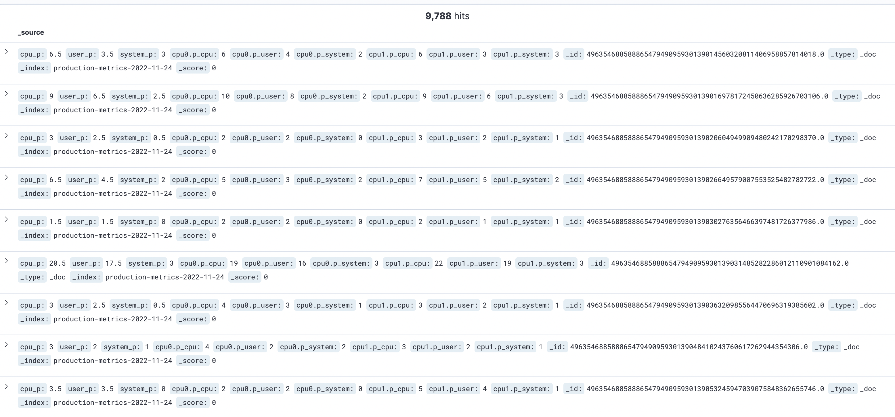 그 후 elastic search에 접속하여 index 설정 한 후 kibana의 discover에서 위와 같이 수집된 metrics data를 확인해볼 수 있습니다.