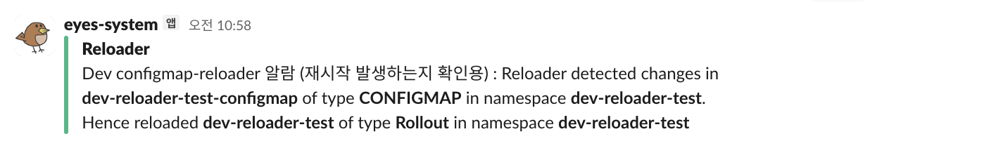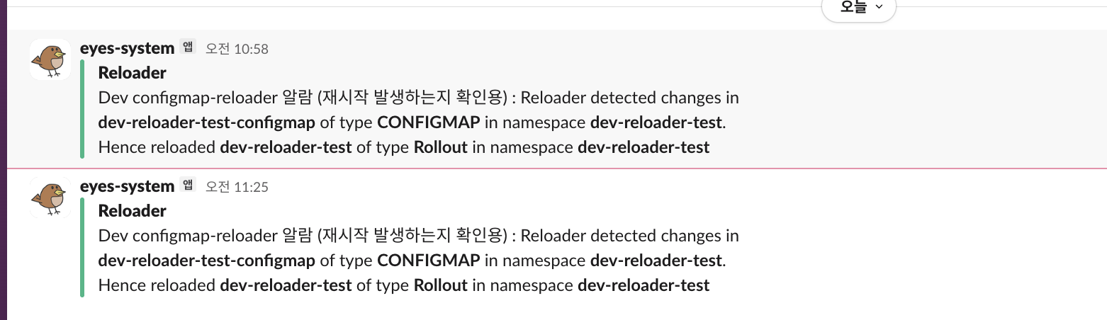 위와 같이 configmap reloader에서 감지되면 slack으로 메시지를 보내게끔 설정했습니다.