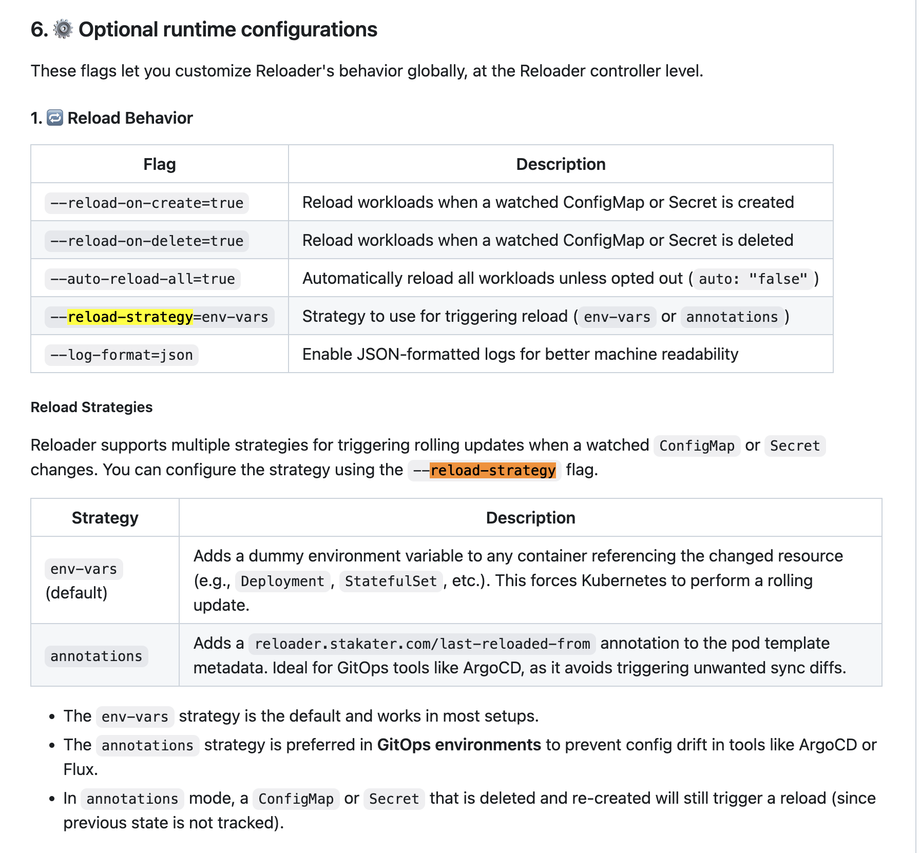 그렇게 테스트를 진행하면서 해당 이슈를 해결하기 위해 공식문서를 보던 중 `--reload-strategy=annotations` 을 `configmap-reloader` 에 설정하면 ArgoCD drift를 피하면서도 rolling update가 가능하다고 합니다. (오!!!)