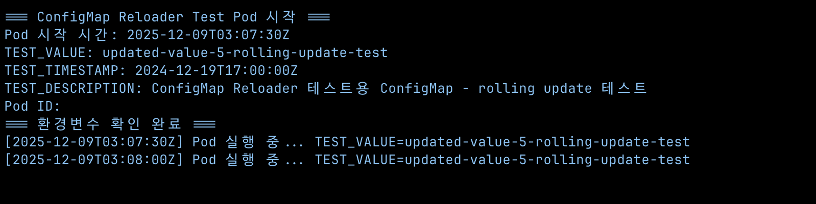 echo "[$(date -u +%Y-%m-%dT%H:%M:%SZ)] Pod 실행 중... TEST_VALUE=$TEST_VALUE"