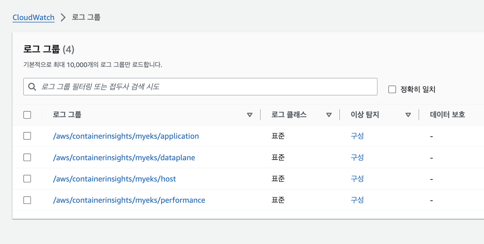 kubectl -n amazon-cloudwatch logs -l app.kubernetes.io/component=amazon-cloudwatch-agent -f # 파드 로그 확인