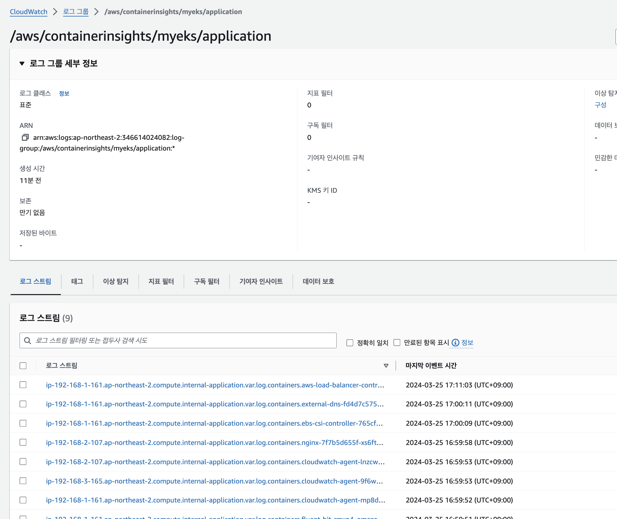 1. /aws/containerinsights/Cluster_Name/application : 로그 소스(All log files in /var/log/containers), 각 컨테이너/파드 로그