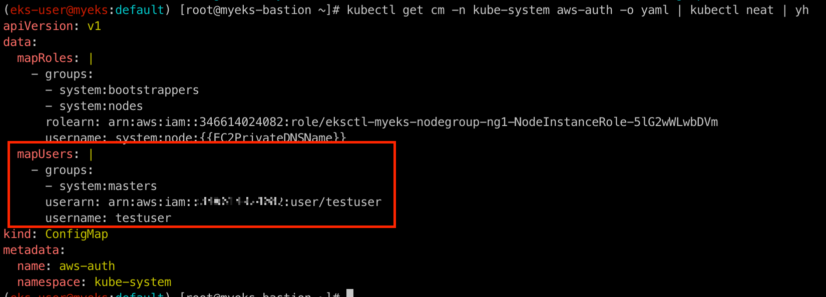 그 후 위의 명령어를 통해 configmap에 설정된 aws-auth 정보를 확인하여 system:masters가 testuser에 부여된 것을 확인합니다.