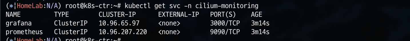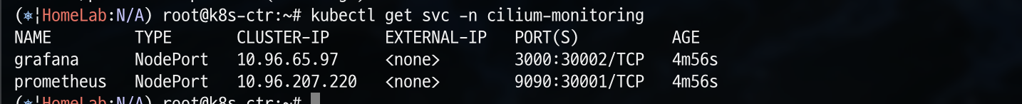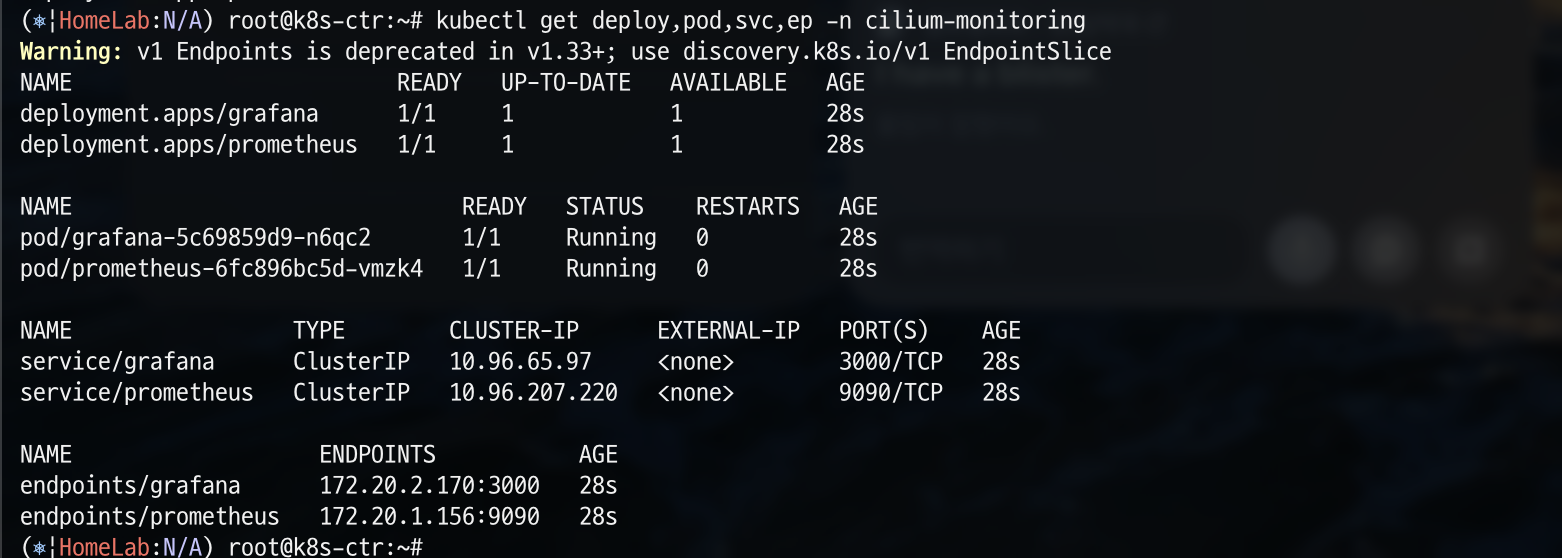 cilium-monitoring 네임스페이스에 Grafana와 Prometheus가 각각 1개씩 정상적으로 실행 중이며, service는 클러스터 내부에서 각각 포트 3000과 9090으로 접근 가능하고, 해당 서비스는 각 파드의 IP와 포트에 연결되어 있게 배포된 것을 확인할 수 있습니다.