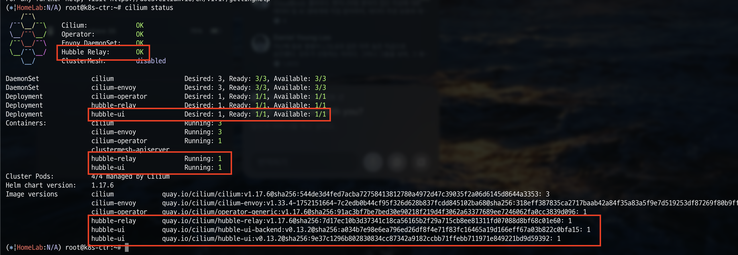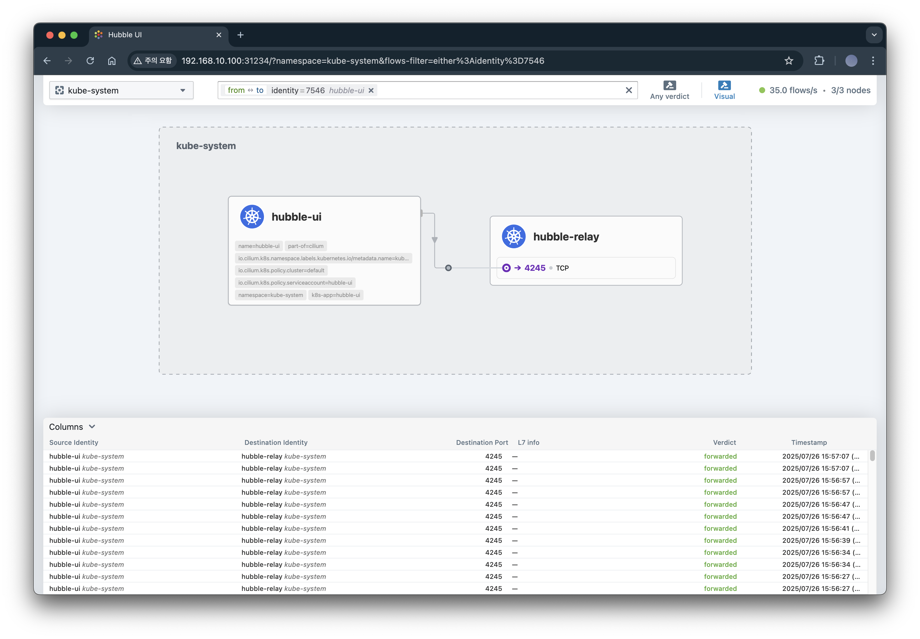 Hubble Relay가 OK로 활성화 되어있고, hubble-relay, hubble-ui가 running 중인 것을 확인할 수 있습니다.