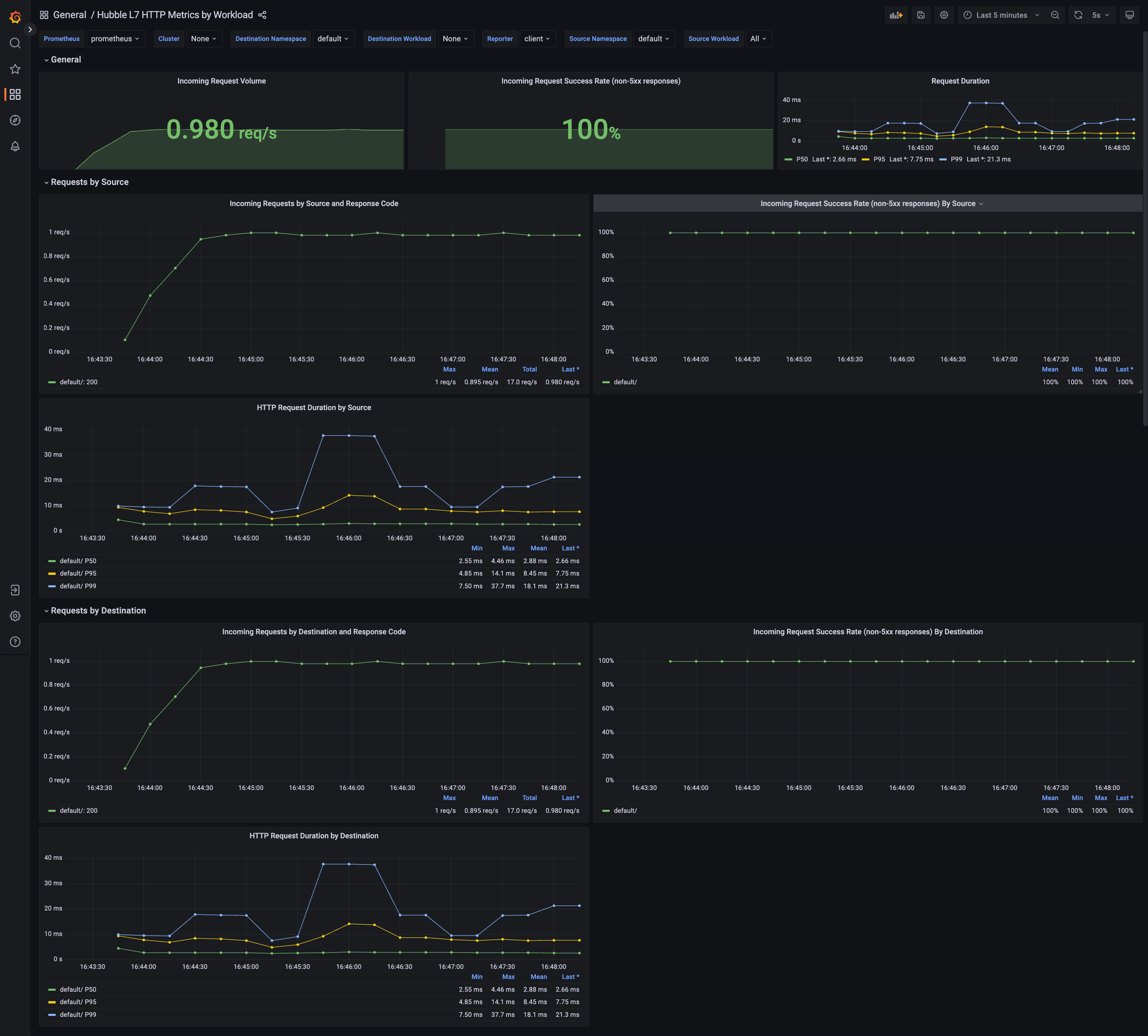 Cilium Hubble의 L7 HTTP 메트릭을 시각화한 대시보드로 L7 메트릭까지 분석할 수 있습니다.