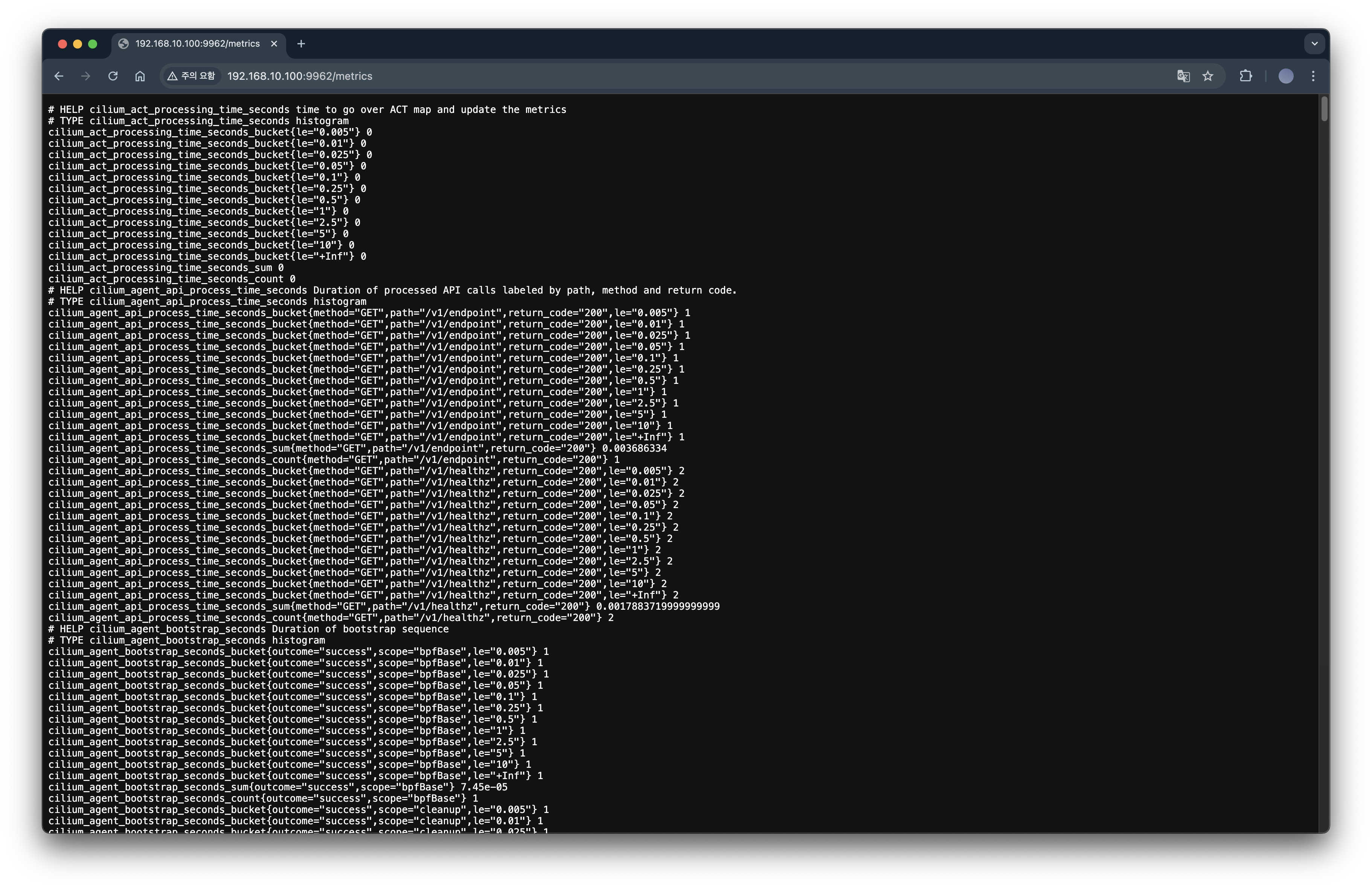 위에서 hubble을 설치할 때 prometheus도 활성화시켰기 때문에 cilium-agent의 metric이 어떻게 쌓이고 있는지 확인해보겠습니다.