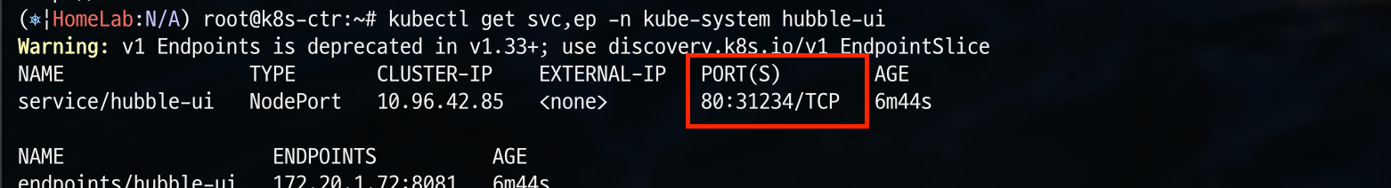 현재 hubble-ui pod의 80 port에 31234 node port로 설정되어 있는 것을 확인할 수 있습니다.