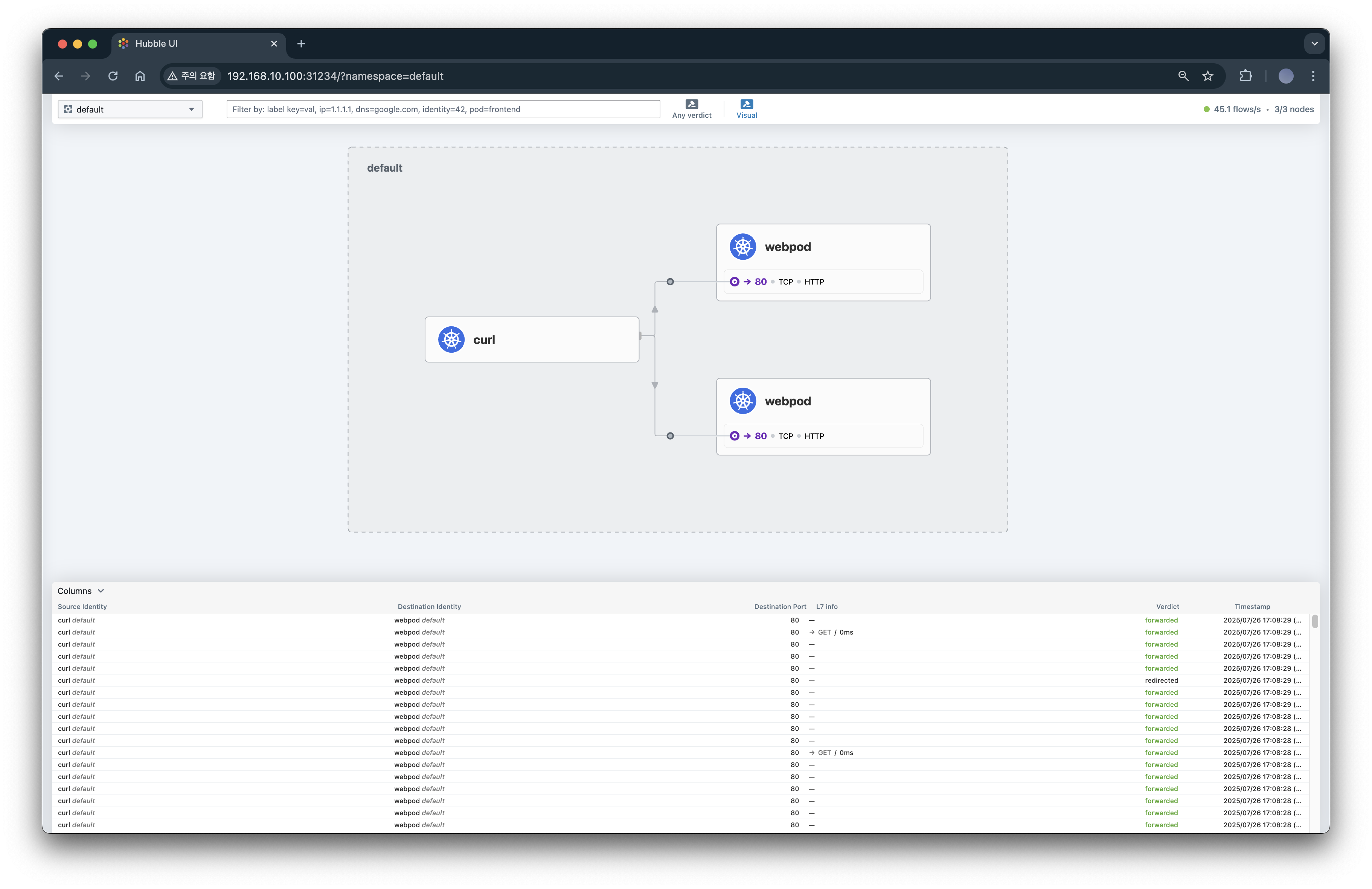 또한, Hubble UI에서 default 네임스페이스 내 curl → webpod 간의 HTTP 통신 흐름을 시각화하여 확인할 수 있으며 더욱 자세하게는 curl-pod에서 반복적으로 webpod으로 HTTP 요청이 발생하고 있으며, 요청은 Cilium 프록시(Envoy)를 통해 처리되고 있고, 일부 요청은 L7 계층에서 분석되어 HTTP 메서드(GET)로 호출하고 있다는 것을 알 수 있습니다.