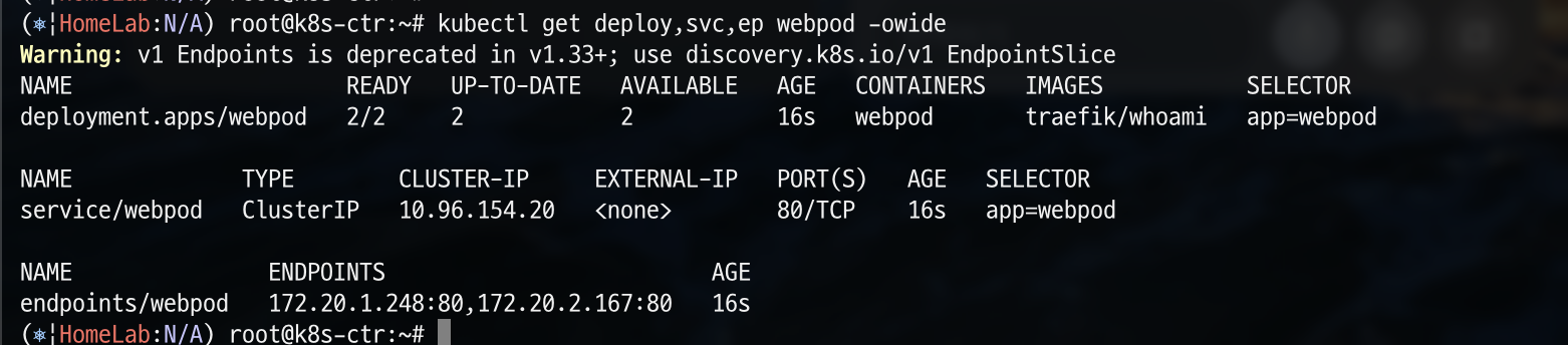 webpod라는 이름의 파드 2개가 클러스터 내에서 정상적으로 배포되었고, webpod service를 통해 ClusterIP인 10.96.154.20:80으로 접근 가능하도록 배포된 것을 확인할 수 있습니다.
