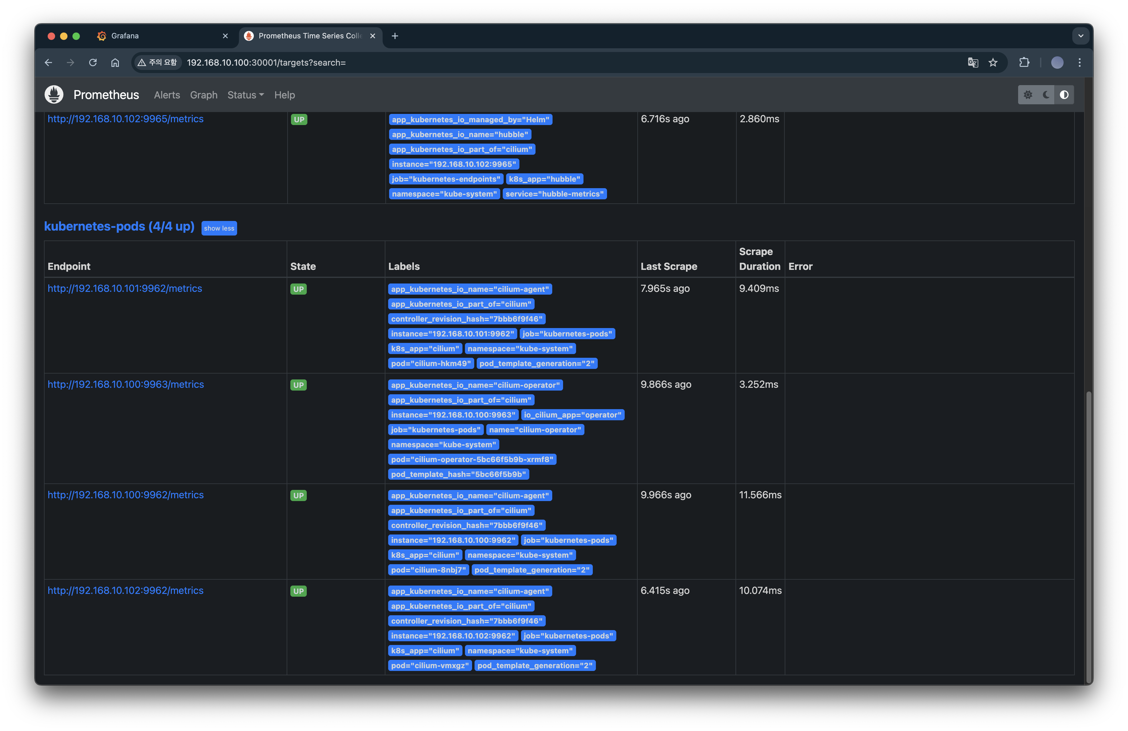 이전에 설치한 prometheus에서 target을 확인해보면 cilium-operator와 daemonset으로 배포한 cilium-agent를 정상적으로 scrap하고 있는 것을 확인할 수 있습니다.