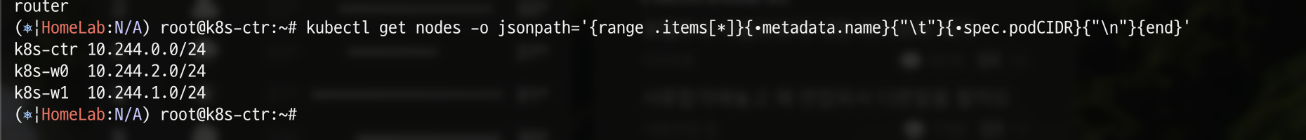 k8s-ctr node의 Pod CIDR은 10.244.0.0/24, k8s-w1은 10.244.1.0/24, k8s-0은 10.244.2.0/24 인 것을 확인할 수 있습니다.
