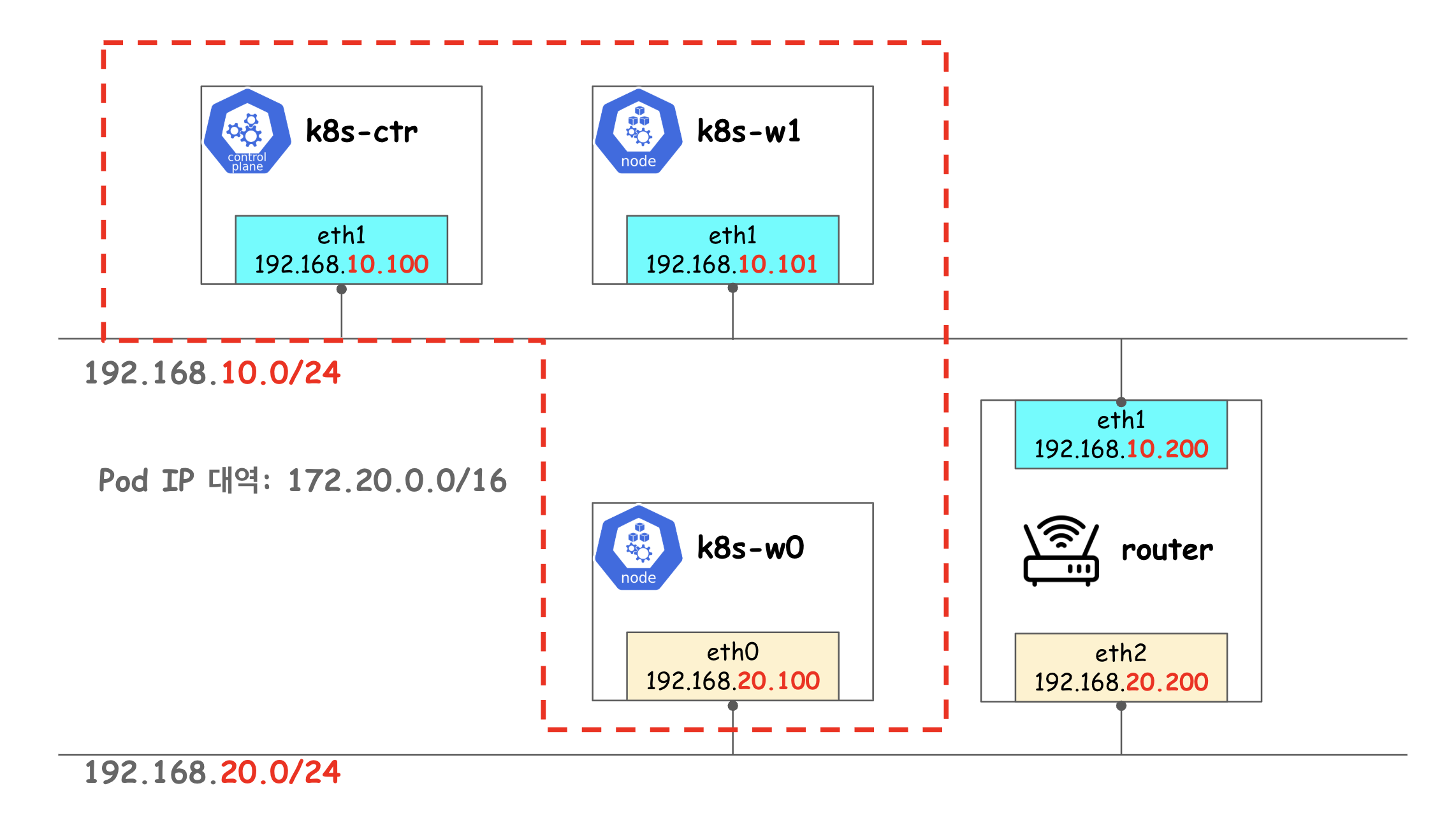 이번 실습을 위해 k8s-w0은 k8s-ctr과 k8s-w1 노드와 다른 네트워크 대역에 배치되어 구성되어 있습니다.