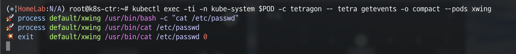 위에서 설정한 환경변수를 통해 일치하는 Pod를 식별한 후, 해당 Pod를 대상으로 지정하여 xwing 파드와 관련된 Tetragon 이벤트를 간략(compact) 형식으로 출력하는 명령어를 실행합니다.