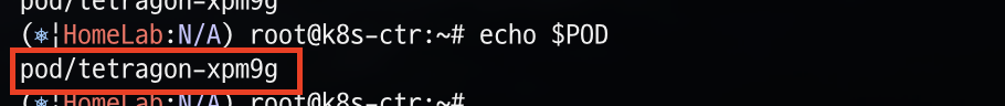 여러 노드가 있는 클러스터에서는 사용하는 Tetragon Pod가 xwing Pod와 동일한 노드에 있어야 실행 이벤트를 캡처할 수 있기에 위 명령어를 통해 xwing Pod와 동일한 Kubernetes 노드에 있는 Tetragon Pod의 이름을 환경 변수로 지정합니다.
