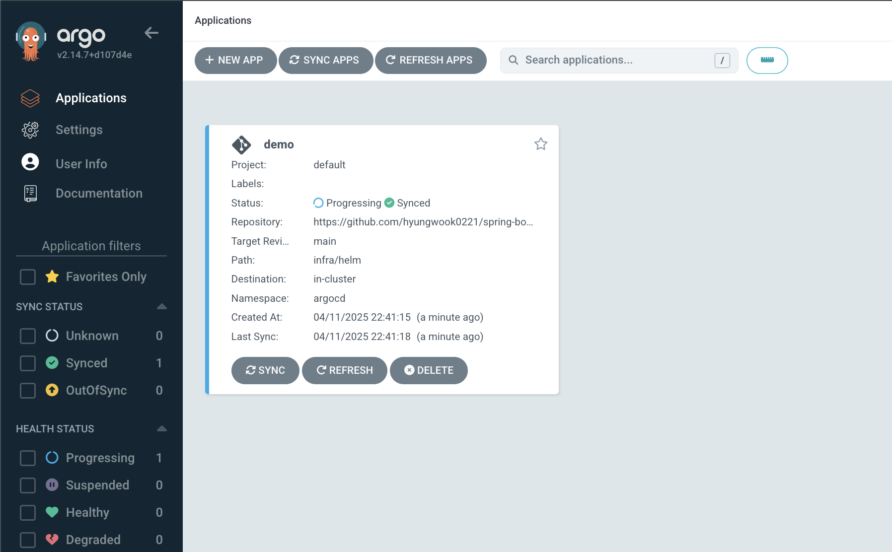 ArgoCD에 접근하면 위와 같이 Demo Application이 생성된 것이 보입니다.
