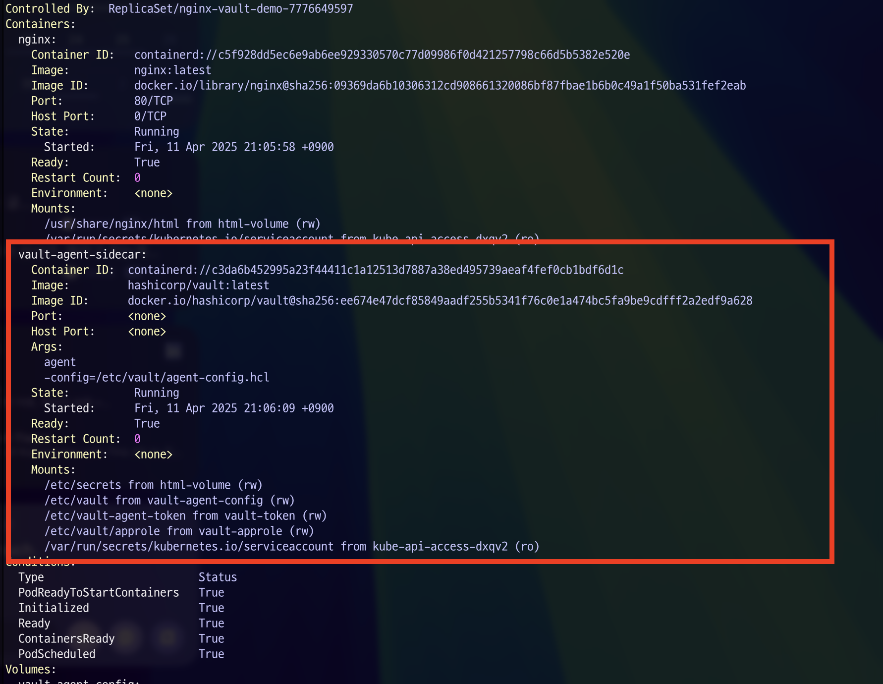 위와 같이 vault에 저장되어 있던 secret 값이 Deployment의 env으로 설정된 것을 확인할 수 있습니다.
