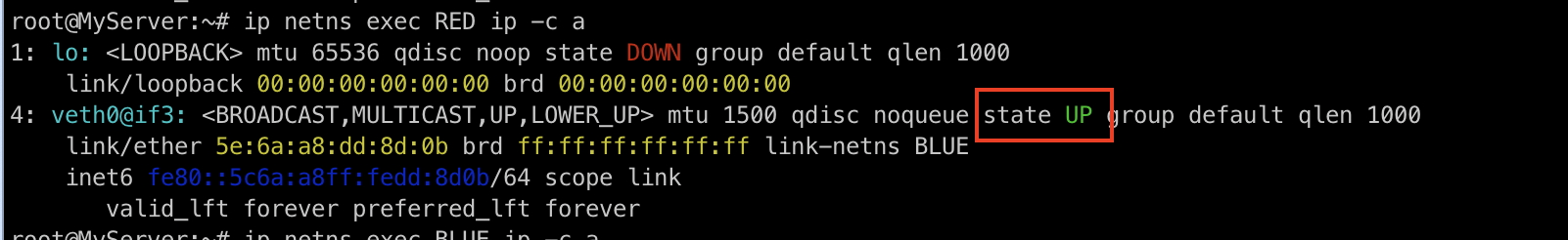 ip netns exec BLUE ip link set beth0 up; ip link set beth1 up