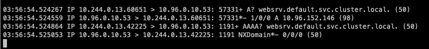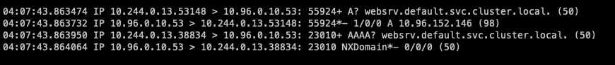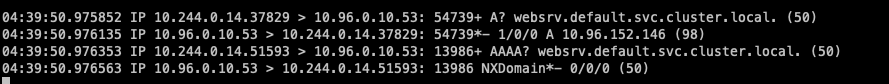 1. websrv.default.svc.cluster.local. -> 질의 성공 (총 1회 질의)