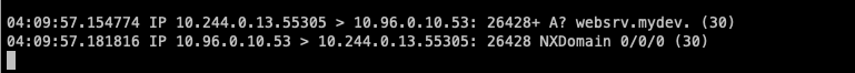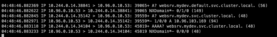 2. websrv.mydev.svc.cluster.local. -> 질의 성공 (총 2회 질의)