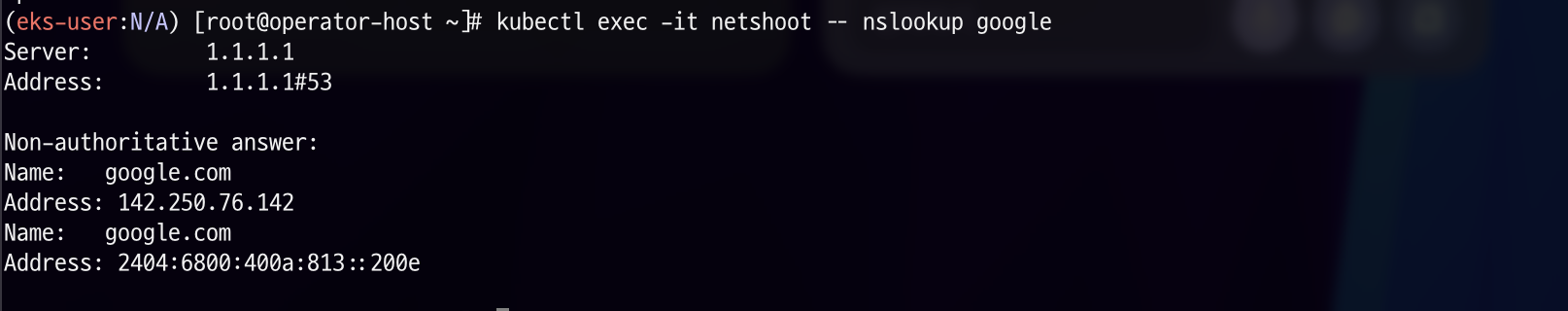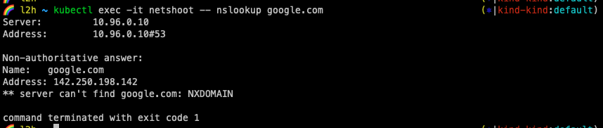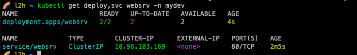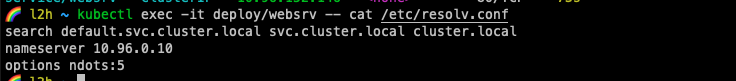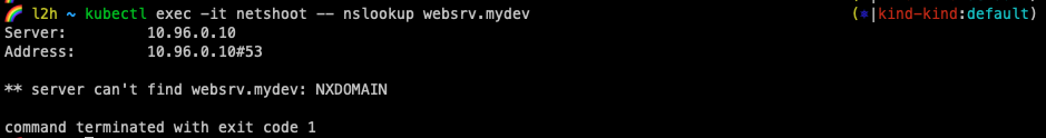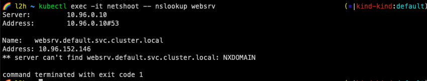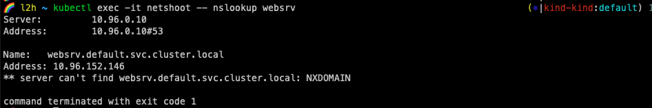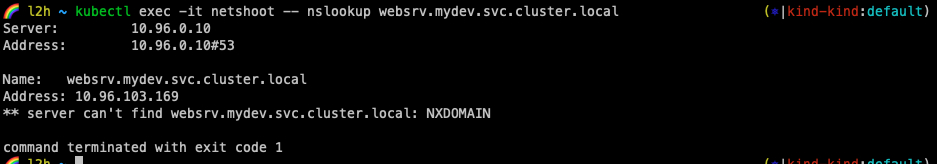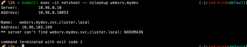 kubectl exec -it netshoot -- nslookup websrv.mydev.svc.cluster.local