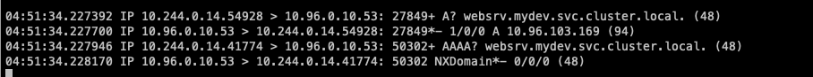 1. websrv.mydev.svc.cluster.local. -> 질의 성공 (총 1번 질의)