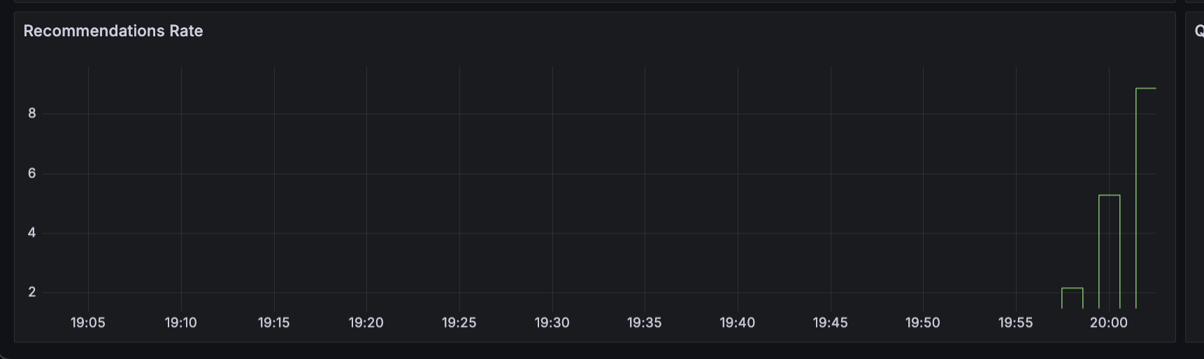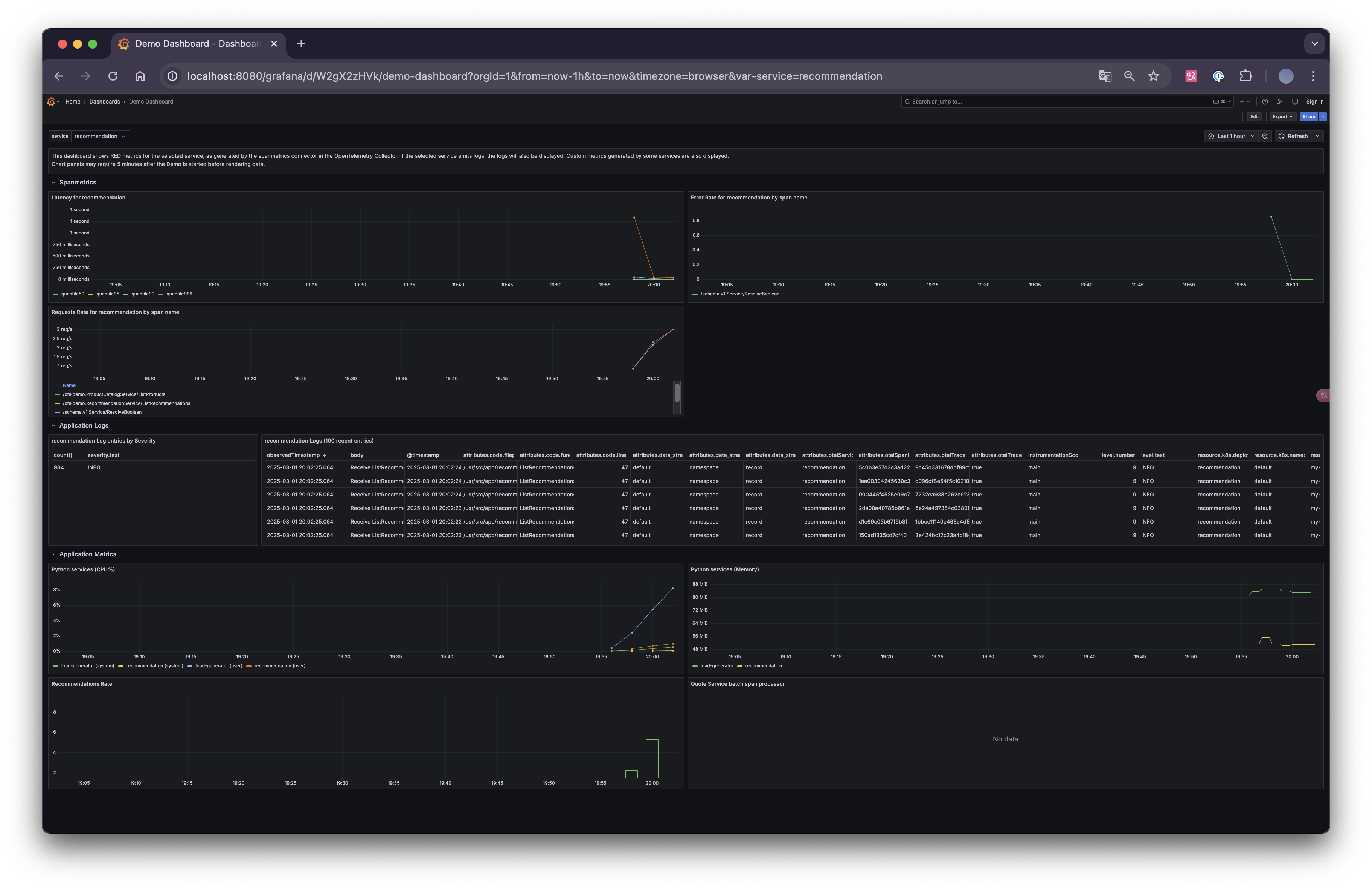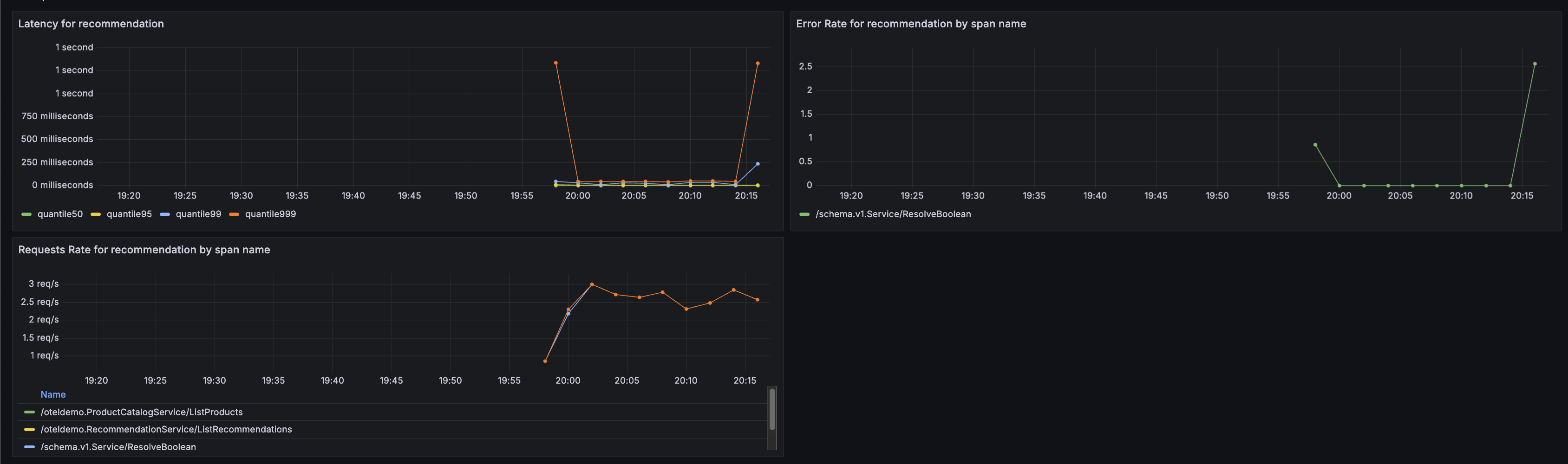 Recommendation Service는 Opentelemetry 메트릭을 Prometheus로 내보낸 데이터를 기반으로 생성되고, Service Latency 및 Error Rate는 OpenTelemetry Collector의 Span Metric Processor를 통해 생성됩니다.